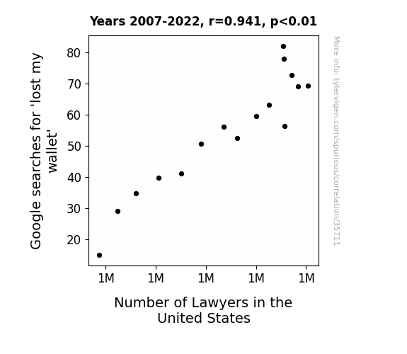 This means 88.5% of the change in the one variable (i.e., Number of Lawyers in the United States) is predictable based on the change in the other (i.e., Google searches for 'lost my wallet') over the 16 years from 2007 through 2022.