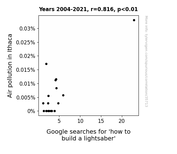 This means 66.5% of the change in the one variable (i.e., Google searches for 'how to build a lightsaber') is predictable based on the change in the other (i.e., Air pollution in Ithaca) over the 18 years from 2004 through 2021.