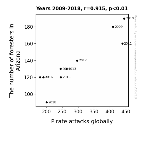 This means 83.6% of the change in the one variable (i.e., Pirate attacks globally) is predictable based on the change in the other (i.e., The number of foresters in Arizona) over the 10 years from 2009 through 2018.
