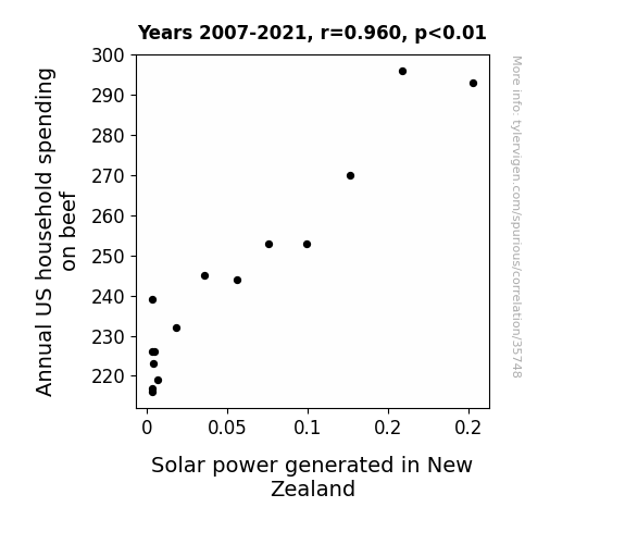 This means 92.1% of the change in the one variable (i.e., Solar power generated in New Zealand) is predictable based on the change in the other (i.e., Annual US household spending on beef) over the 15 years from 2007 through 2021.
