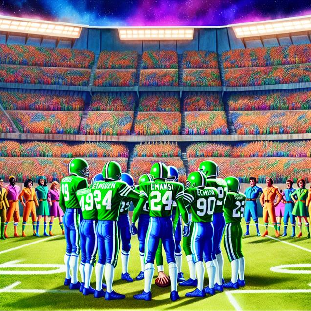 Prompt: An image that looks like a scene from a Disney movie illustrating the joyous moment when the Seattle Seahawks, clad in their iconic colors, gather in a huddle on the vibrant green field of a grand stadium. Crowds of enthusiastic fans, sporting vibrant jerseys adorned with the name "Emani", fill the stands, adding a dazzling array of colors to the scene. The players appear to radiate an alluring cosmic confidence as the vibrant energy from the crowd seems to envelop them with an aura of invincibility. The excitement builds to a crescendo as the play unfolds, culminating in a stunning touchdown executed with grace and finesse, igniting a jubilant roar of triumph from the elated crowd. The depiction should include only scenes, people, and objects, it should not include text or speech bubbles.