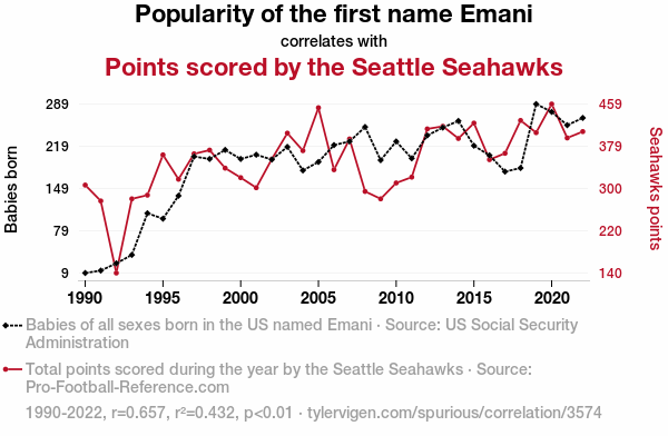 A linear line chart with years as the X-axis and two variables on the Y-axis. The first variable is Popularity of the first name Emani and the second variable is Points scored by the Seattle Seahawks.  The chart goes from 1990 to 2022, and the two variables track closely in value over that time. Small Image