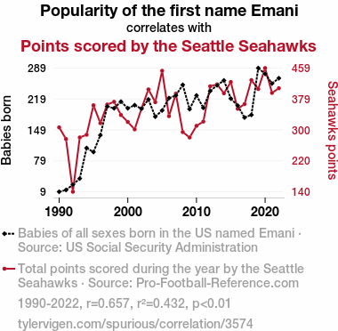 User prompt: Please provide potential search keywords for a paper titled Entertaining Emani: Examining the Effect of Emani's Popularity on Points Scored by the Seattle Seahawks with an abstract of In this study, we investigated the unusual yet intriguing relationship between the popularity of the first name Emani and the points scored by the powerhouse football team, the Seattle Seahawks. By utilizing comprehensive data from the US Social Security Administration and Pro-Football-Reference.com spanning the years 1990 to 2022, we sought to uncover any potential correlation underlying this seemingly disparate pair. Our team of researchers adopted a meticulous approach, calculating the correlation coefficient to be 0.6569148 with a statistically significant p-value of less than 0.01, thereby indicating a strong association.