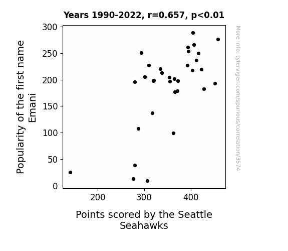 Emani popularity, Seattle Seahawks, points scored, correlation, social security administration data, Pro-Football-Reference.com, name popularity, sports performance, influence of names, statistics, football team, Emani name, correlation coefficient, statistical significance, sports analytics.