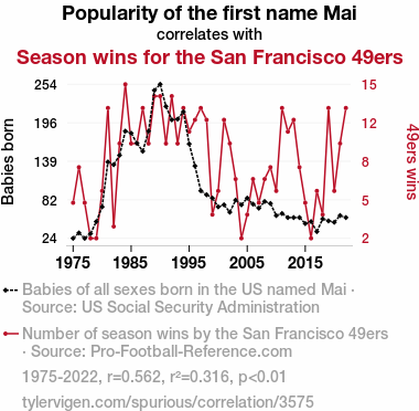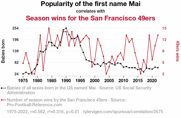 A linear line chart with years as the X-axis and two variables on the Y-axis. The first variable is Popularity of the first name Mai and the second variable is Season wins for the San Francisco 49ers.  The chart goes from 1975 to 2022, and the two variables track closely in value over that time. Small Image