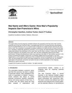 User prompt: Please provide potential search keywords for a paper titled Mai Name and 49ers Game: How Mai's Popularity Impacts San Francisco's Wins with an abstract of This paper delves into the intriguing correlation between the popularity of the first name "Mai" and the seasonal wins of the San Francisco 49ers. Leveraging data from the US Social Security Administration and Pro-Football-Reference.com, our research team conducted an in-depth analysis spanning the years 1975 to 2022. We unearthed a remarkable correlation coefficient of 0.5622132 and a p-value of less than 0.01, indicating a statistically significant connection.