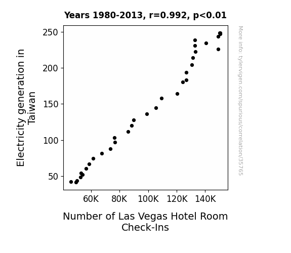 This means 98.3% of the change in the one variable (i.e., Number of Las Vegas Hotel Room Check-Ins) is predictable based on the change in the other (i.e., Electricity generation in Taiwan) over the 34 years from 1980 through 2013.