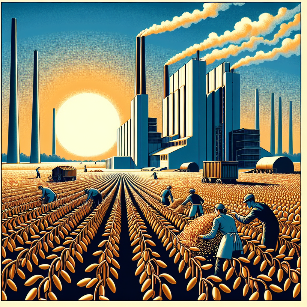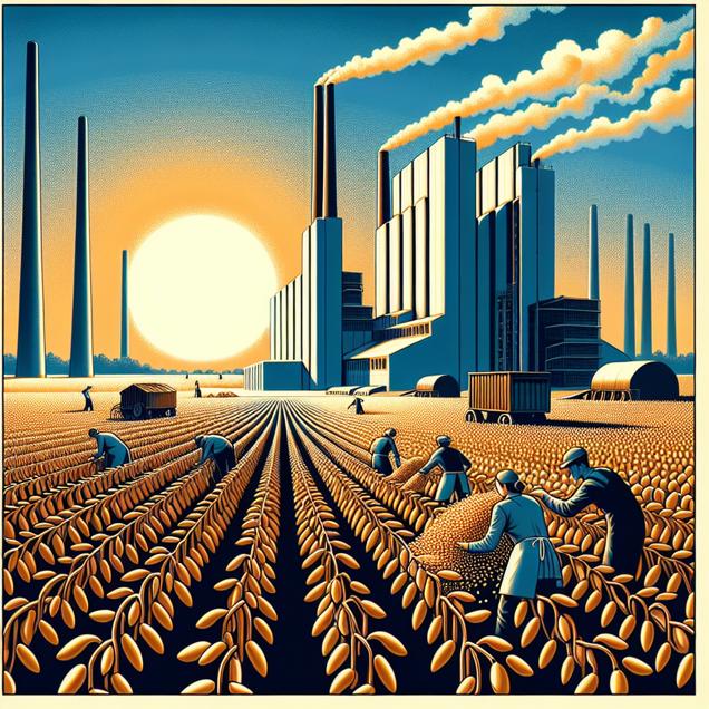 ChatGPT: Generate an image inspired by the Bauhaus style depicting a sun-drenched South Dakota field. Show rows of tall soybean plants swaying gently in the warm breeze, their leaves bearing the mark of GMO use. Nearby, a towering geothermal power plant stands in stark contrast against the serene landscape. Across the world, in Russia, depict workers unloading surplus GMO soybeans from South Dakota. Suddenly, an accidental mix-up causes the beans to tumble into the power plant's furnace, igniting a comical burst of energy. The power plant sputters to life, emitting plumes of steam and generating a sudden spike in geothermal power production, much to the bemusement of onlookers. Capture the essence of the scene in a visually striking and playful manner while staying true to the theme of Bauhaus.