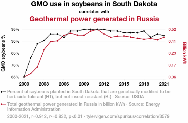 User prompt: Please make up a funny explanation for how an increase in GMO use in soybeans in South Dakota caused Geothermal power generated in Russia to increase.