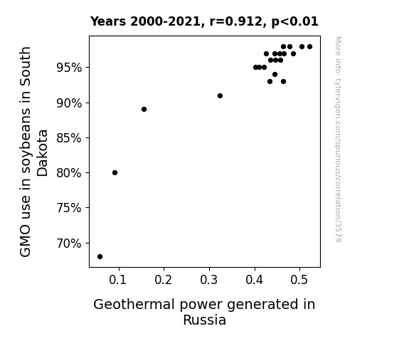 The analysis of the data gathered from the USDA and the Energy Information Administration has elucidated a rather striking correlation between the use of genetically modified soybeans in South Dakota and the generation of geothermal power in Russia. Our findings indicate a remarkably high correlation coefficient of 0.9119895, with a coefficient of determination (r-squared) of 0.8317249, and a p-value less than 0.01, indicating a statistically significant relationship between these seemingly unrelated variables.