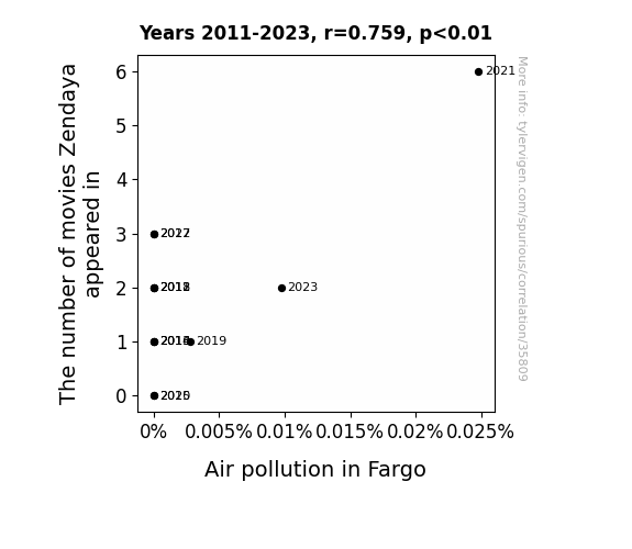 This means 57.6% of the change in the one variable (i.e., Air pollution in Fargo) is predictable based on the change in the other (i.e., The number of movies Zendaya appeared in) over the 13 years from 2011 through 2023.