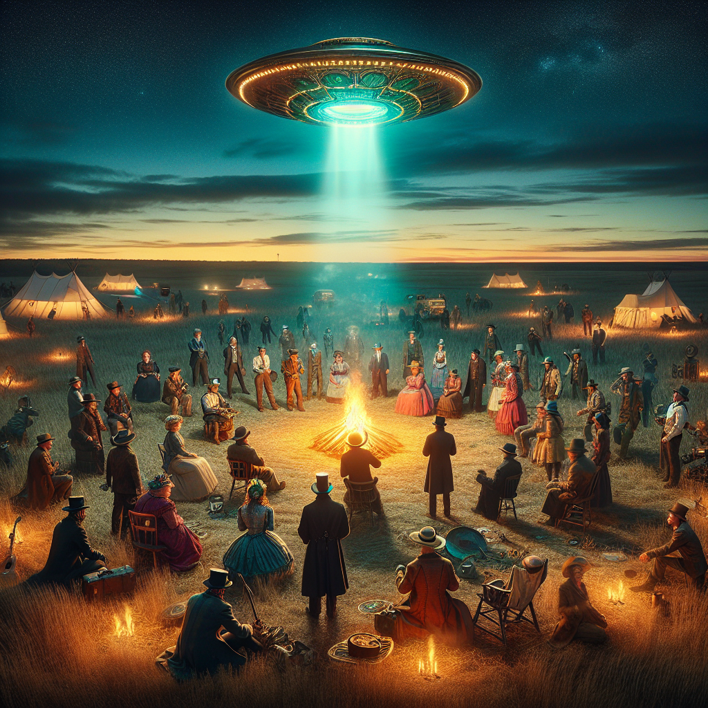 Prompt: "Create an image of a steampunk-inspired scene in a vast Oklahoma field at dusk. A group of people with the name Parker gather in a circle, illuminated by the warm glow of a bonfire. As they stand together, chatting and laughing, a mysterious glow appears in the sky above them. A bright UFO hovers, seemingly drawn to the gathering of Parkers, casting an otherworldly light over the scene." The depiction should include only scenes, people, and objects, it should not include text or speech bubbles.