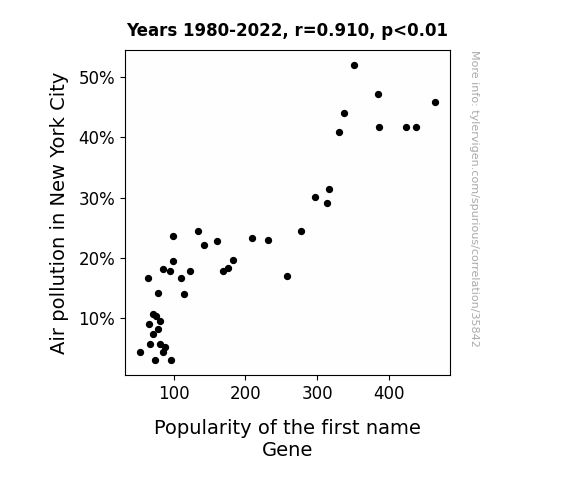 This means 82.8% of the change in the one variable (i.e., Popularity of the first name Gene) is predictable based on the change in the other (i.e., Air pollution in New York City) over the 43 years from 1980 through 2022.
