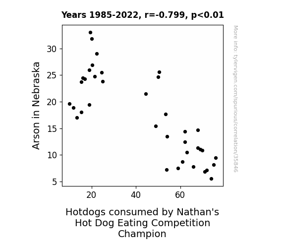 This means 63.8% of the change in the one variable (i.e., Hotdogs consumed by Nathan's Hot Dog Eating Competition Champion) is predictable based on the change in the other (i.e., Arson in Nebraska) over the 38 years from 1985 through 2022.