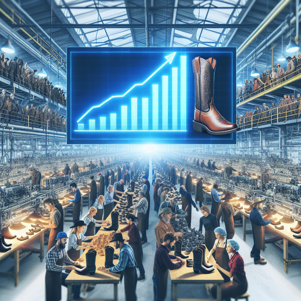 Prompt: Prompt: Generate an image of a cowboy boot factory filled with workers crafting new pairs of cowboy boots amidst a high-tech environment. In the background, display a large screen with Thermo Fisher Scientific's stock price ticker continuously rising, reflecting the company's success due to the increased use of their materials in the manufacturing process spurred by the popularity of the name Walker. The factory floor should be teeming with activity, showcasing the blend of traditional craftsmanship and cutting-edge technology. The depiction should include only scenes, people, and objects, it should not include text or speech bubbles.