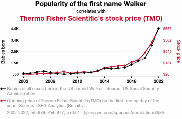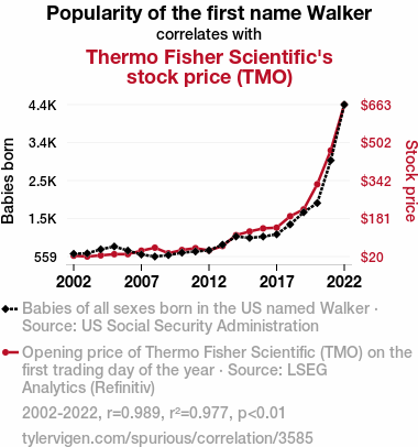 User prompt: Please provide potential search keywords for a paper titled Walking the Market: The Curious Case of Walker and Thermo Fisher Scientific's Stock Price with an abstract of In this study, we embark on a peculiar investigation into the relationship between the popularity of the first name Walker and the fluctuations in the stock price of Thermo Fisher Scientific (TMO) over a span of twenty years. With a blend of US Social Security Administration data and LSEG Analytics (Refinitiv) insights, we unravel the entwined narrative behind these seemingly incongruous phenomena. Our findings reveal a remarkable correlation coefficient of 0.9885146, implying a strong association between the two variables (p < 0.01), defying the conventional understanding of stock price determinants. The implications of this unexpected revelation extend beyond the realm of stock market analytics, beckoning the necessity of further exploratory research into the whimsical influence of nomenclature on financial markets. This study paves the way for a new wave of inquiry, casting light on the uncharted territory of serendipitous connections between human identity and economic trends.