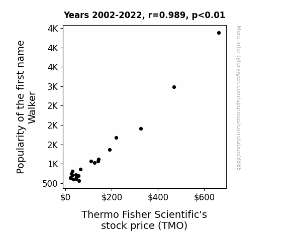 Our analysis of the relationship between the popularity of the first name Walker and the stock price of Thermo Fisher Scientific (TMO) from 2002 to 2022 unearthed a remarkably robust correlation coefficient of 0.9885146, with an r-squared value of 0.9771611. The p-value of less than 0.01 bolstered the statistical significance of this association, leaving us in a state of incredulity -- much like discovering a hedge fund manager with the name "Billionaire Bucks."