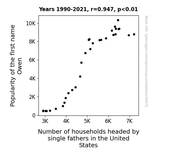 This means 89.6% of the change in the one variable (i.e., Number of households headed by single fathers in the United States) is predictable based on the change in the other (i.e., Popularity of the first name Owen) over the 32 years from 1990 through 2021.