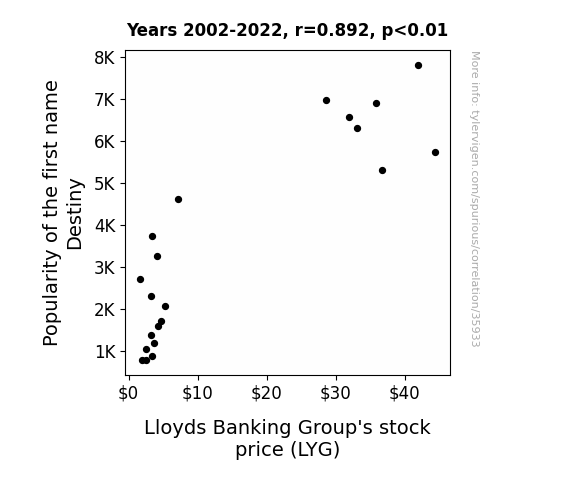 This means 79.6% of the change in the one variable (i.e., Lloyds Banking Group's stock price (LYG)) is predictable based on the change in the other (i.e., Popularity of the first name Destiny) over the 21 years from 2002 through 2022.