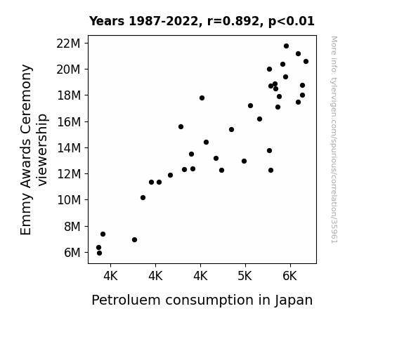 This means 79.6% of the change in the one variable (i.e., Petroluem consumption in Japan) is predictable based on the change in the other (i.e., Emmy Awards Ceremony viewership) over the 36 years from 1987 through 2022.