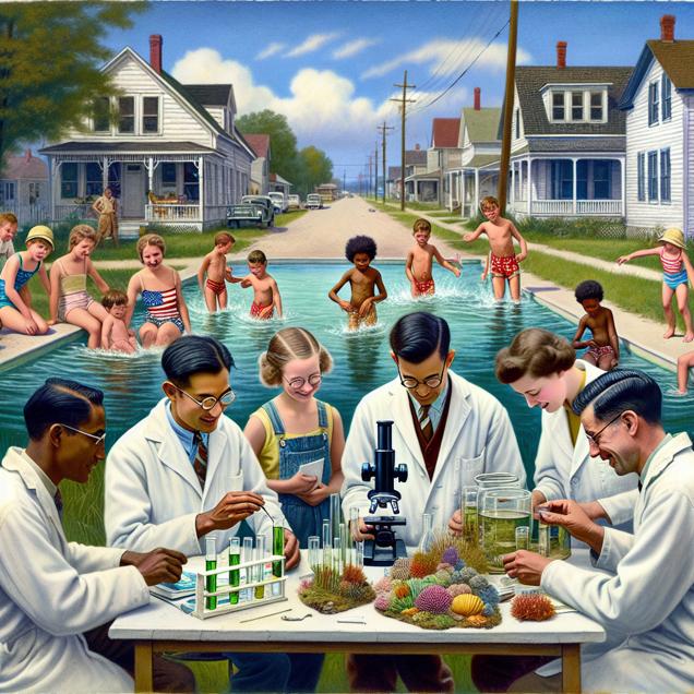 Prompt: Generate an image of a meme that depicts a small Missouri town setting. In the foreground, enthusiastic biological technicians are gathered around a table, examining water samples and aquatic life. Behind them, children play in a swimming pool, with one of them named Coral. Other kids look on with curiosity, showing interest in the underwater world. The meme should capture the juxtaposition of scientific exploration and playful childhood wonder in a simple and intriguing manner. The depiction should include only scenes, people, and objects, it should not include text or speech bubbles.