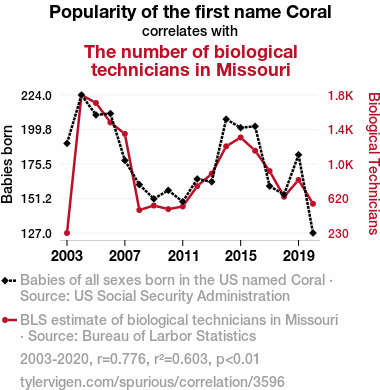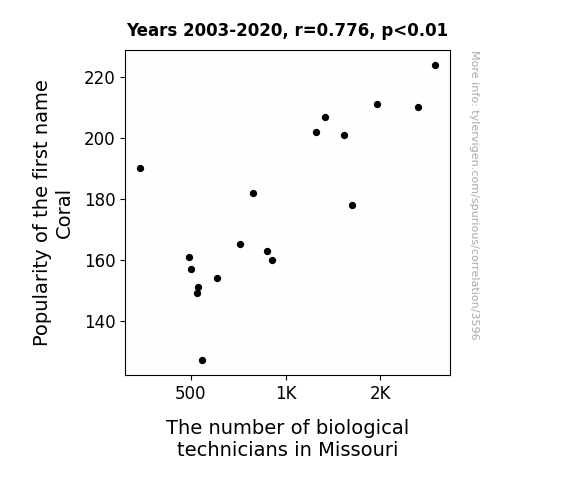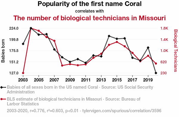 - The spurious research paper: The Coral Connection: Examining the Link Between the Popularity of the Name Coral and the Employment of Biological Technicians in Missouri