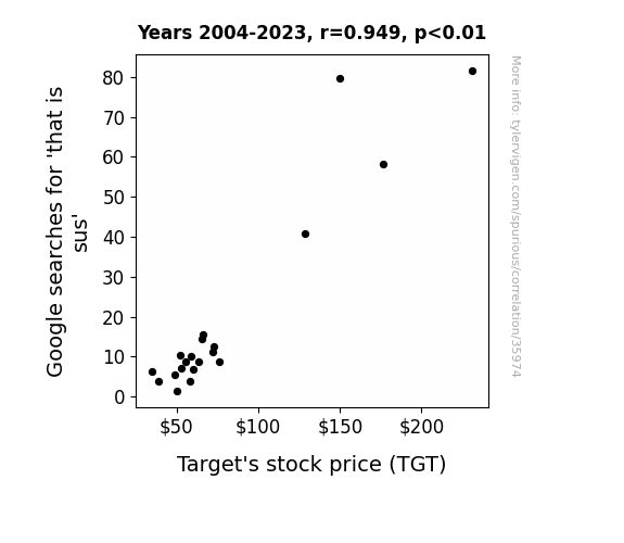 This means 90.1% of the change in the one variable (i.e., Target's stock price (TGT)) is predictable based on the change in the other (i.e., Google searches for 'that is sus') over the 20 years from 2004 through 2023.