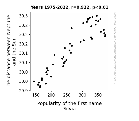 This means 85% of the change in the one variable (i.e., Popularity of the first name Silvia) is predictable based on the change in the other (i.e., The distance between Neptune and the Sun) over the 48 years from 1975 through 2022.