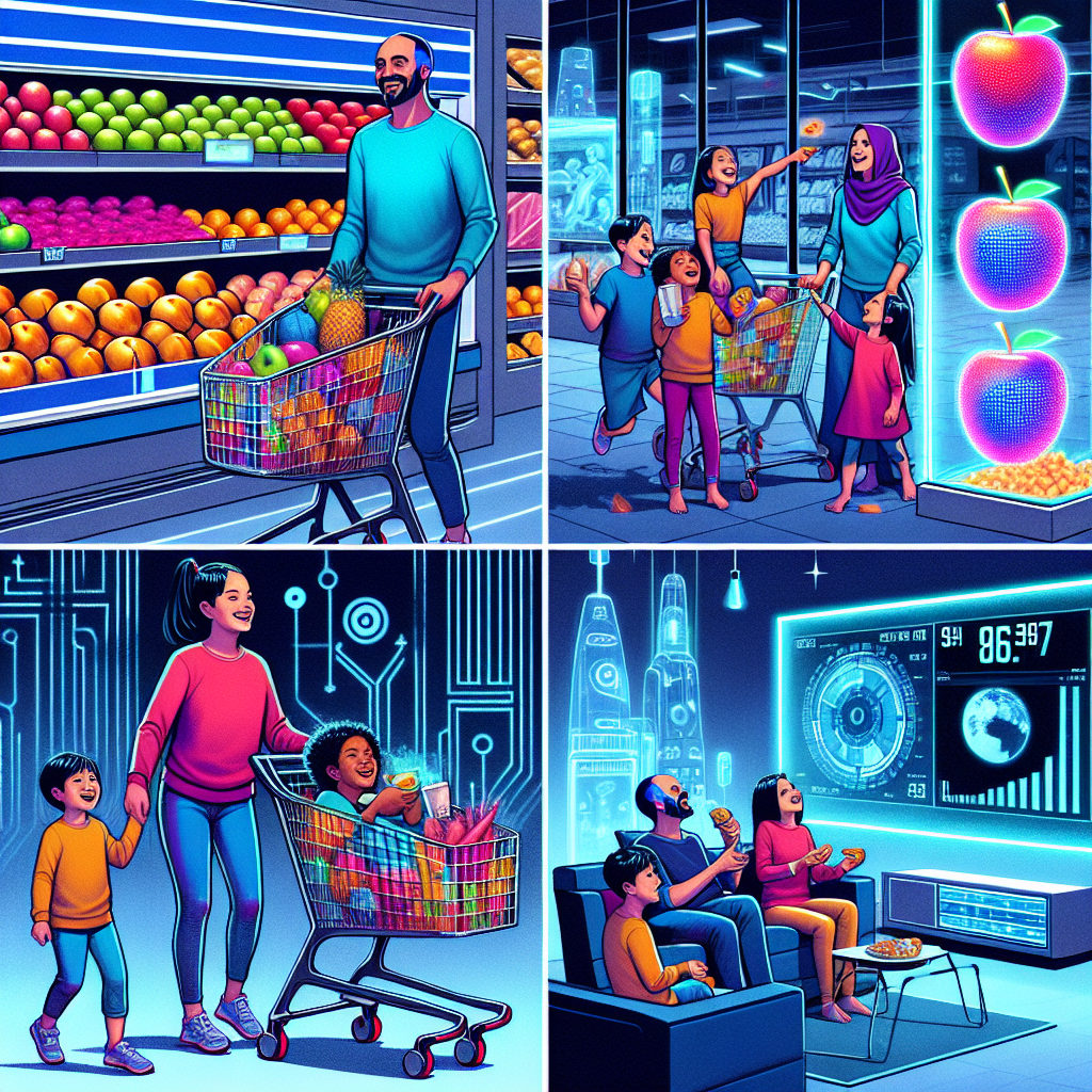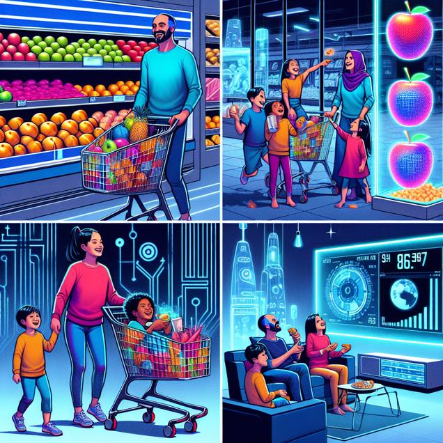 User prompt: Please respond with an image generation prompt that would be likely to create an interesting visual using DALLE-3, using the following style: [ Futuristic ] and depicting this scene: A family is seen at a grocery store, loading up their shopping cart with bags of processed fruits. They are smiling and chatting as they pick out their favorite fruits. In the next scene, the family is back at home enjoying their fruits while watching a Sony TV that's displaying the Sony Group's stock price (SONY) on the screen. The stock price is shown to be increasing alongside their enjoyment. Keep the visual depiction simple. Do not include any words or speech bubbles.