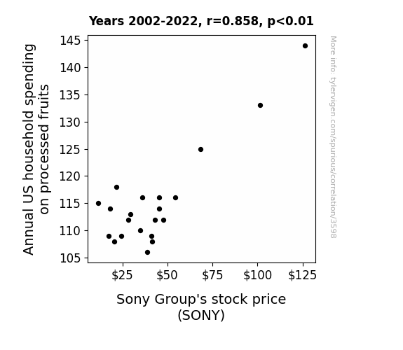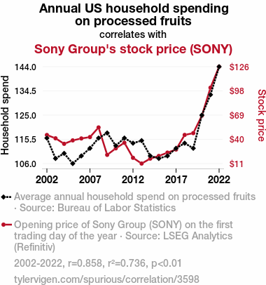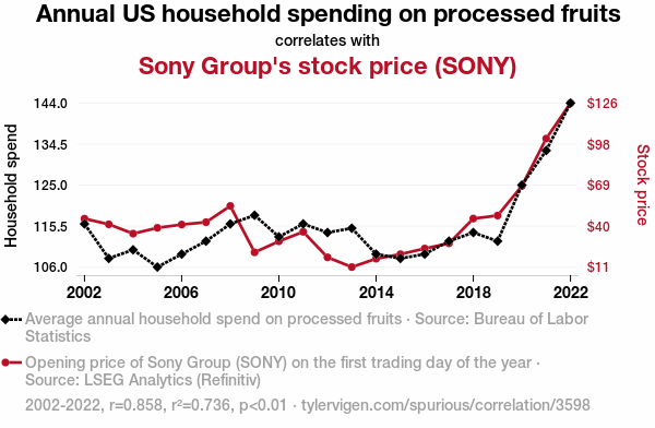 - The spurious research paper: The Big Apple's Influence: How US Household Spending on Processed Fruits Can A-peel to Sony's Stock Price