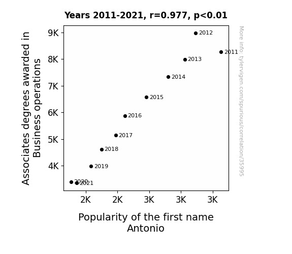 This means 95.5% of the change in the one variable (i.e., Popularity of the first name Antonio) is predictable based on the change in the other (i.e., Associates degrees awarded in Business operations) over the 11 years from 2011 through 2021.