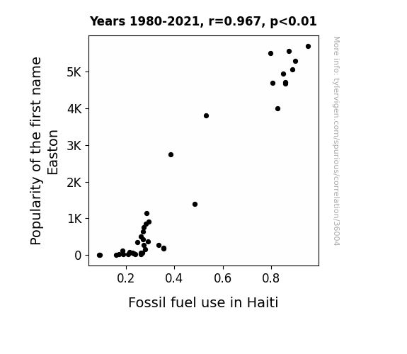 This means 93.4% of the change in the one variable (i.e., Fossil fuel use in Haiti) is predictable based on the change in the other (i.e., Popularity of the first name Easton) over the 42 years from 1980 through 2021.