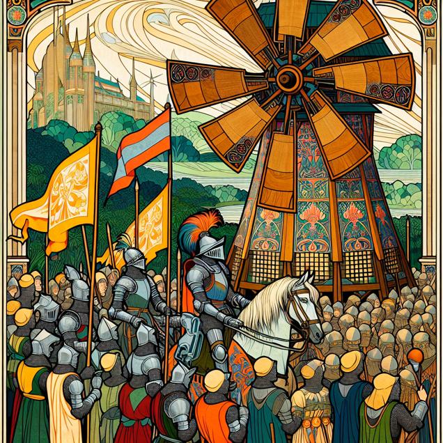 User prompt: Please respond with an image generation prompt that would be likely to create an interesting visual using DALLE-3, using the following style: [ Art nouveau ] and depicting this scene: In Thailand, a group of enthusiastic knights, dressed in shining armor and flying colorful banners with the name "Arthur" emblazoned on them, stand proudly next to an ancient-looking windmill. They eagerly turn the giant wooden blades, harnessing the power of the wind to generate energy for the surrounding community. The cheers of onlookers fill the air as the wind power generated from the reenacted medieval windmills increases, bringing a renewable energy source to the nation. Keep the visual depiction simple. Do not include any words or speech bubbles.