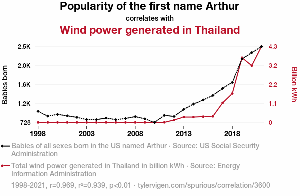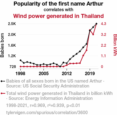 - The spurious research paper: Blowin' in the Arthur: A Correlational Study of the Popularity of the Name Arthur and Wind Power Generation in Thailand