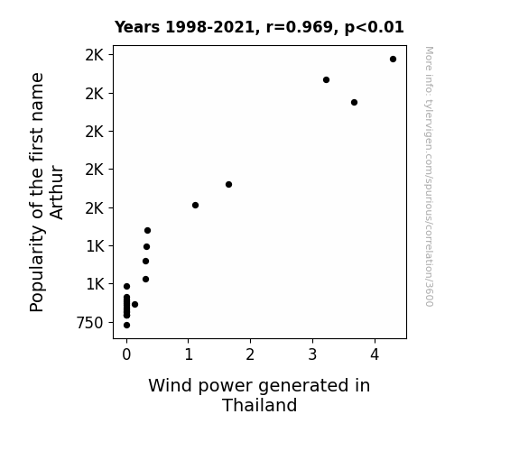 popularity of the name Arthur, wind power generation, Thailand, correlational study, US Social Security Administration data, Energy Information Administration data, wind power trends, correlation coefficient, p-value, name frequency analysis