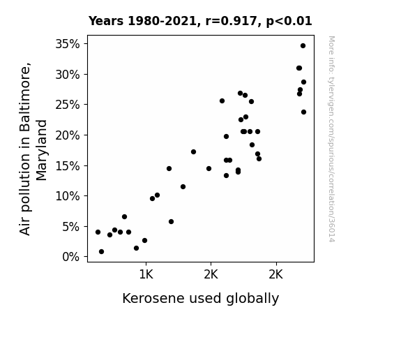 This means 84% of the change in the one variable (i.e., Kerosene used globally) is predictable based on the change in the other (i.e., Air pollution in Baltimore, Maryland) over the 42 years from 1980 through 2021.