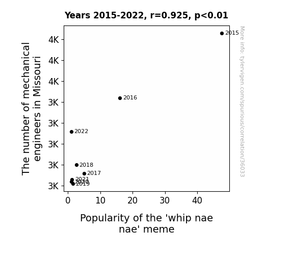 This means 85.6% of the change in the one variable (i.e., Popularity of the 'whip nae nae' meme) is predictable based on the change in the other (i.e., The number of mechanical engineers in Missouri) over the 8 years from 2015 through 2022.