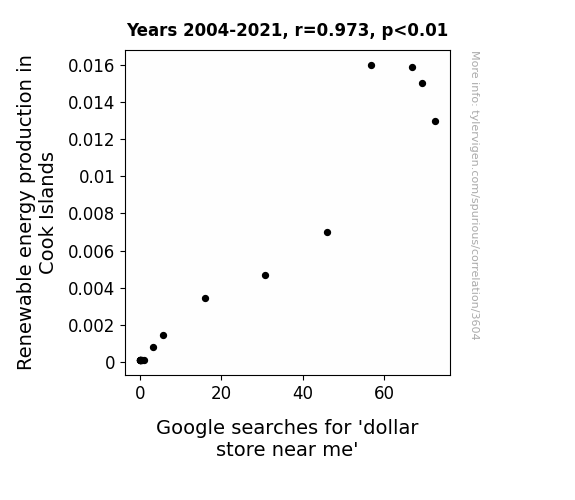 - The spurious research paper: Solar Illumination: Shedding Light on the Connection Between Renewable Energy Production in Cook Islands and Google Searches for 'Dollar Store Near Me'