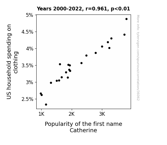 This means 92.3% of the change in the one variable (i.e., Popularity of the first name Catherine) is predictable based on the change in the other (i.e., US household spending on clothing) over the 23 years from 2000 through 2022.