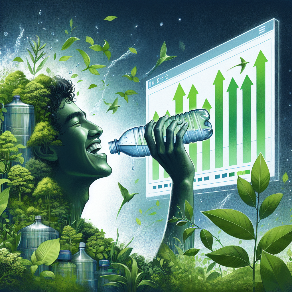 Prompt: Generate an image that embodies the essence of sustainable living and high-tech innovation. Show a figure joyfully drinking from a crystal-clear, renewable plastic water bottle, nestled among vibrant, thriving plants. In the background, feature a stock ticker displaying EOG's ascending stock price, indicating growth and success. The scene should emanate an atmosphere of freshness, vitality, and advancement. The depiction should include only scenes, people, and objects, it should not include text or speech bubbles.