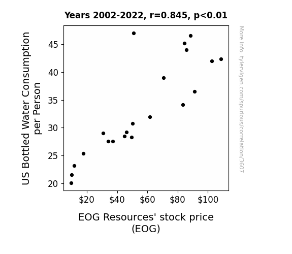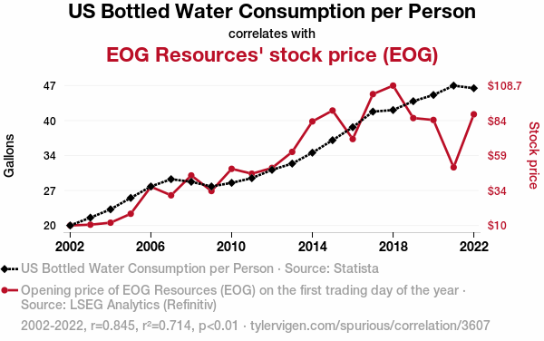 This means 71.4% of the change in the one variable (i.e., EOG Resources' stock price (EOG)) is predictable based on the change in the other (i.e., US Bottled Water Consumption per Person) over the 21 years from 2002 through 2022.