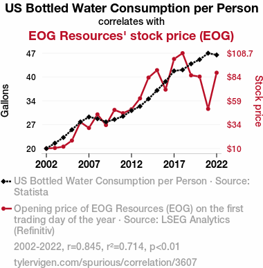 US bottled water consumption, EOG Resources stock price, correlation coefficient, market indicator, Statista data, LSEG Analytics, Refinitiv, stock market fluid dynamics, market trends, financial implications, statistical significance, relationship analysis