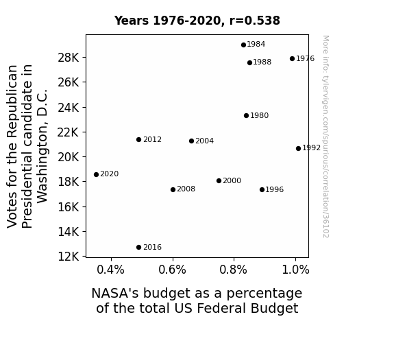 This means 28.9% of the change in the one variable (i.e., NASA's budget as a percentage of the total US Federal Budget) is predictable based on the change in the other (i.e., Votes for the Republican Presidential candidate in Washington, D.C.) over the 12 years from 1976 through 2020.