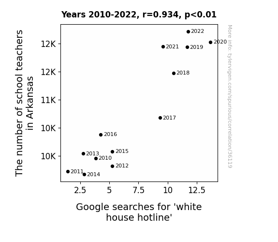 This means 87.2% of the change in the one variable (i.e., Google searches for 'white house hotline') is predictable based on the change in the other (i.e., The number of school teachers in Arkansas) over the 13 years from 2010 through 2022.