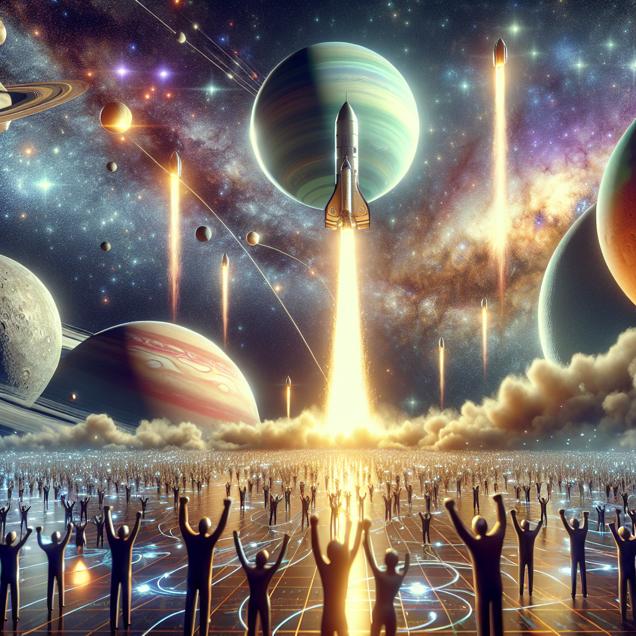 User prompt: Please respond with an image generation prompt that would be likely to create an interesting visual using DALLE-3, using the following style: [ Futuristic ] and depicting this scene: In the vast expanse of space, Neptune and Uranus drift farther apart, their distance increasing as if reaching for the stars. Meanwhile, WEC Energy Group's stock price shoots upward, soaring like a rocket, as if propelled by the cosmic energy between the two distant planets. Shareholders, represented by tiny figures, cheer ecstatically as the stock's trajectory reaches new heights, reflecting the stellar financial impact of the cosmic alignment. Keep the visual depiction simple. Do not include any words or speech bubbles.