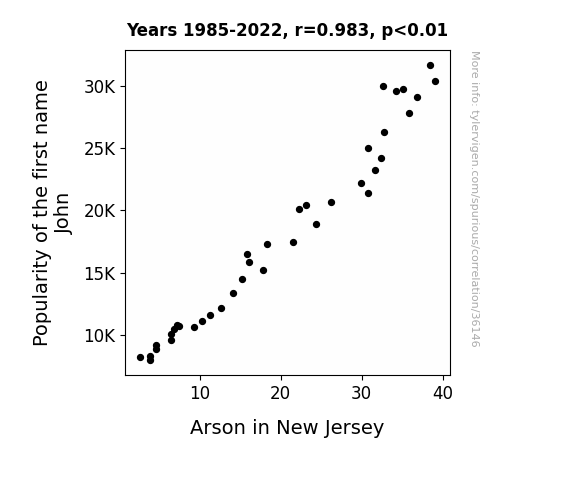 This means 96.6% of the change in the one variable (i.e., Arson in New Jersey) is predictable based on the change in the other (i.e., Popularity of the first name John) over the 38 years from 1985 through 2022.
