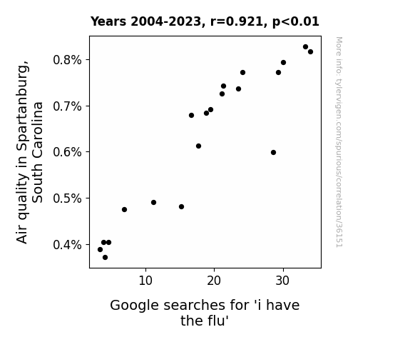This means 84.9% of the change in the one variable (i.e., Google searches for 'i have the flu') is predictable based on the change in the other (i.e., Air quality in Spartanburg, South Carolina) over the 20 years from 2004 through 2023.