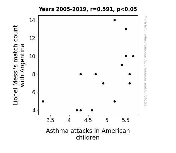 This means 34.9% of the change in the one variable (i.e., Asthma attacks in American children) is predictable based on the change in the other (i.e., Lionel Messi's match count with Argentina) over the 15 years from 2005 through 2019.