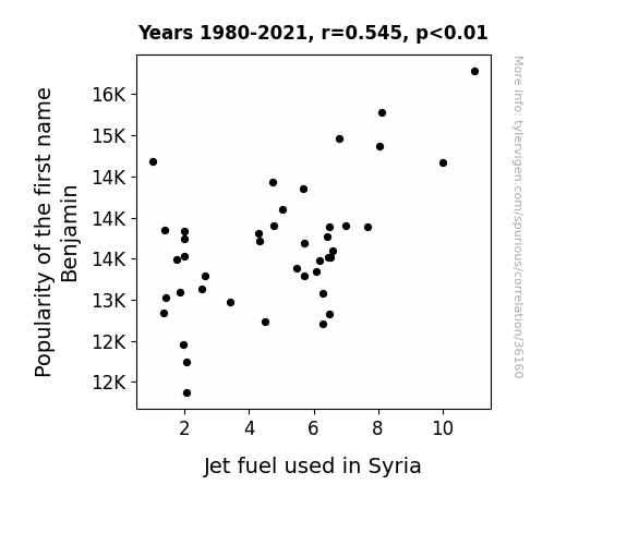 This means 29.7% of the change in the one variable (i.e., Jet fuel used in Syria) is predictable based on the change in the other (i.e., Popularity of the first name Benjamin) over the 42 years from 1980 through 2021.