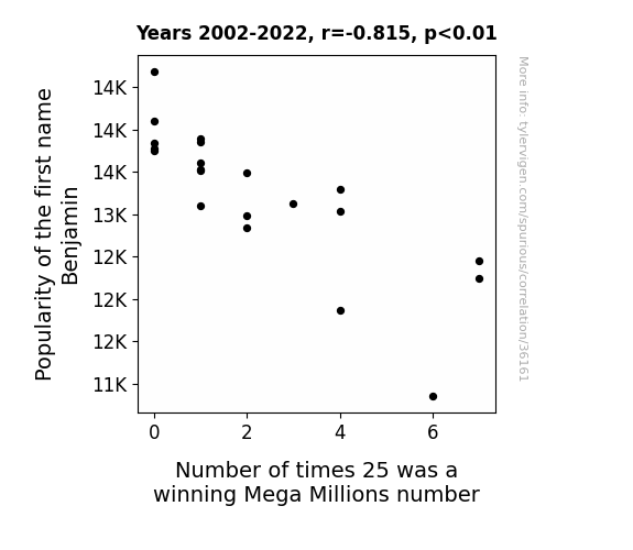 This means 66.5% of the change in the one variable (i.e., Number of times 25 was a winning Mega Millions number) is predictable based on the change in the other (i.e., Popularity of the first name Benjamin) over the 21 years from 2002 through 2022.